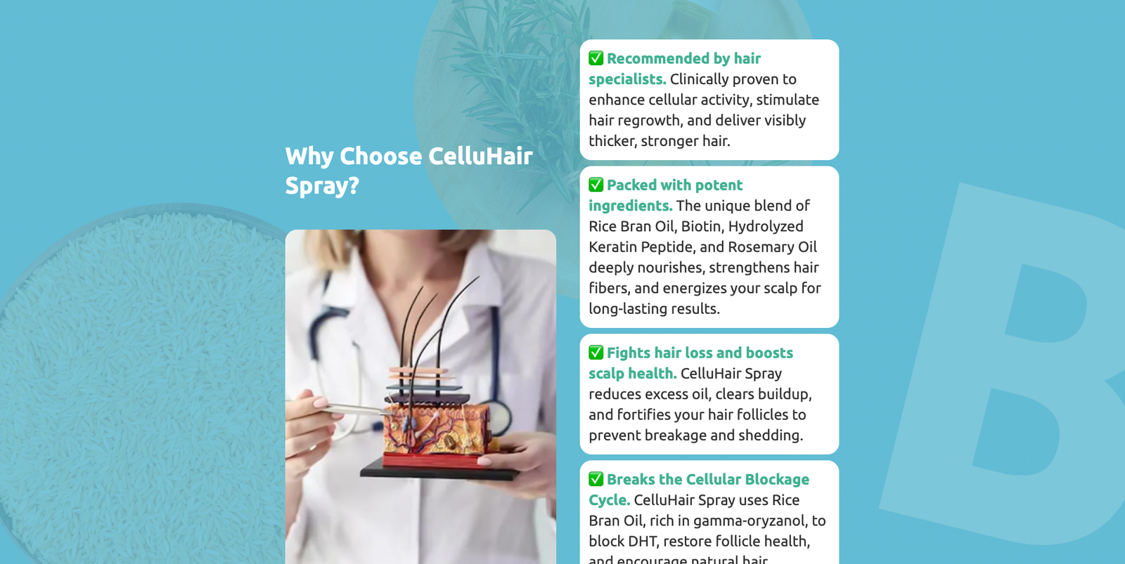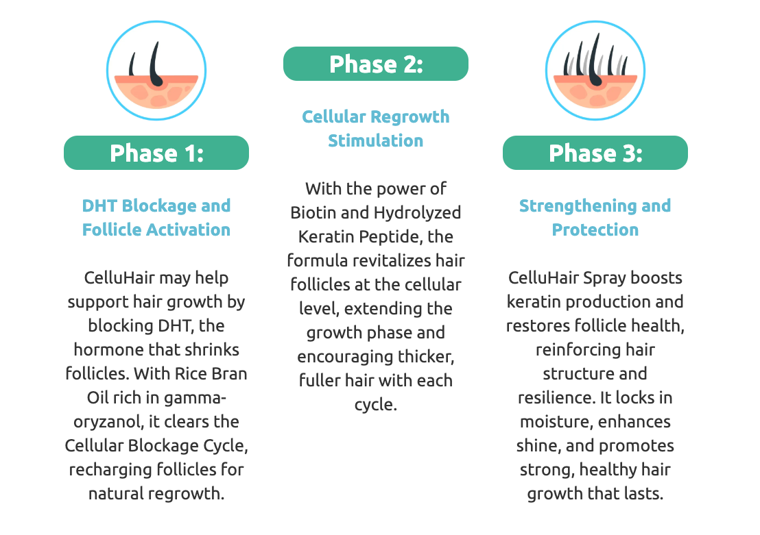 CelluHair Spray is expertly crafted to provide a powerful hair support system. This revolutionary formula helps boost hair, promotes cellular regeneration, and restores your confidence with the #1 solution for thicker, healthier hair.
